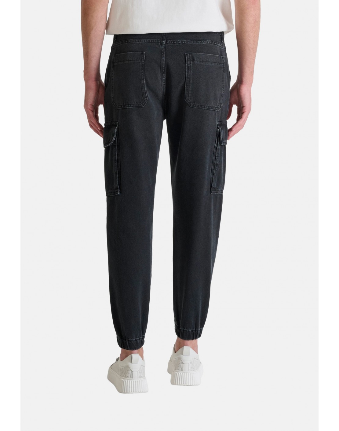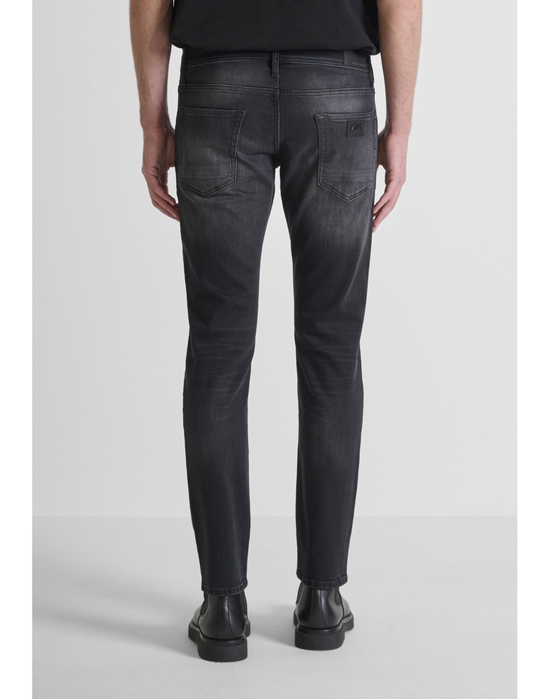 Corte ceñido, pero relajado, capaz de realzar la silueta sin dejar de ser cómodo gracias a la suavidad del tejido. Color negro con desgastados y lavado degradado. Largo regular, costuras tono sobre tono y parche con el logotipo aplicado en la parte posterior.