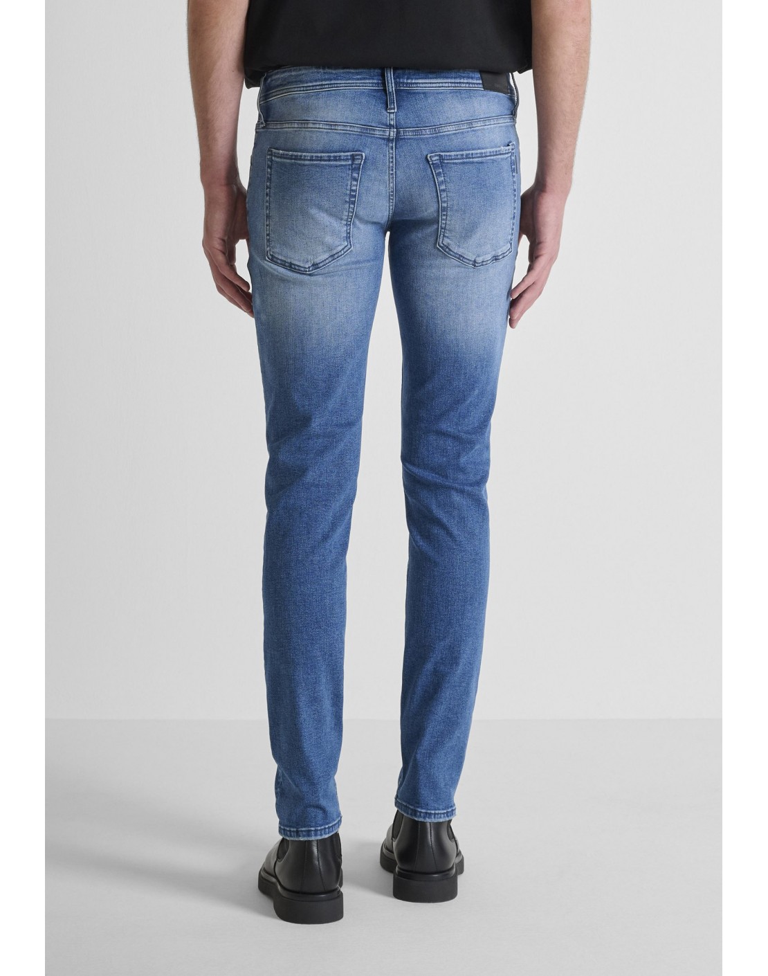 Confeccionado con un tejido vaquero elástico, este modelo presenta pequeños detalles rasgados, desgastados y un lavado degradado. Costuras tono sobre tono y cierre de cremallera y botón.