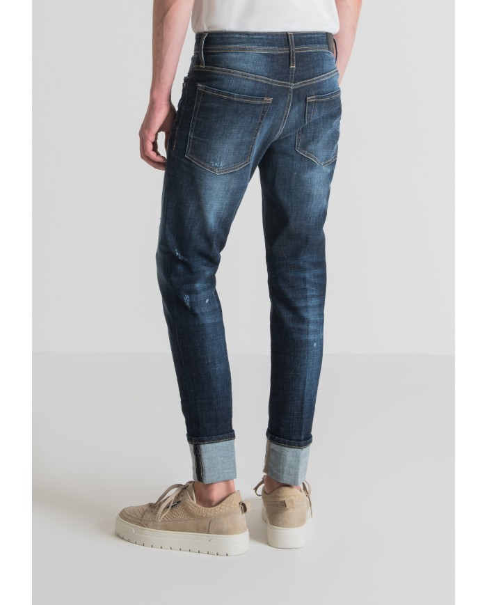 Vaqueros de cinco bolsillos de Antony Morato. Corte «super skinny» y están fabricados con una mezcla de algodón vaquero elástico. Efecto lavado con ligeras abrasiones localizadas y manchas tono sobre tono. Costuras de contraste en color tabaco destacan sobre el lavado oscuro de este modelo, que se lleva con un maxidobladillo en el bajo.